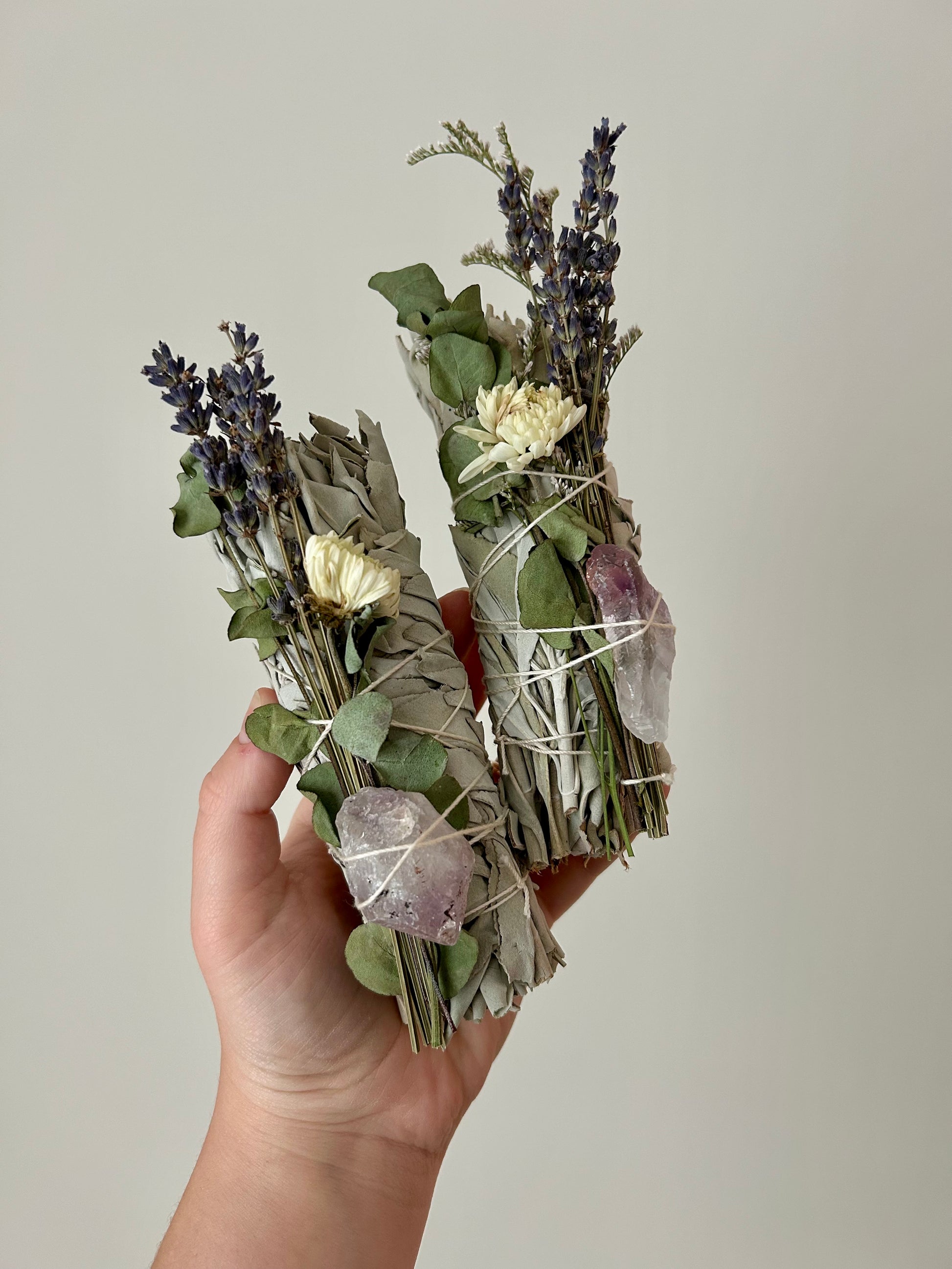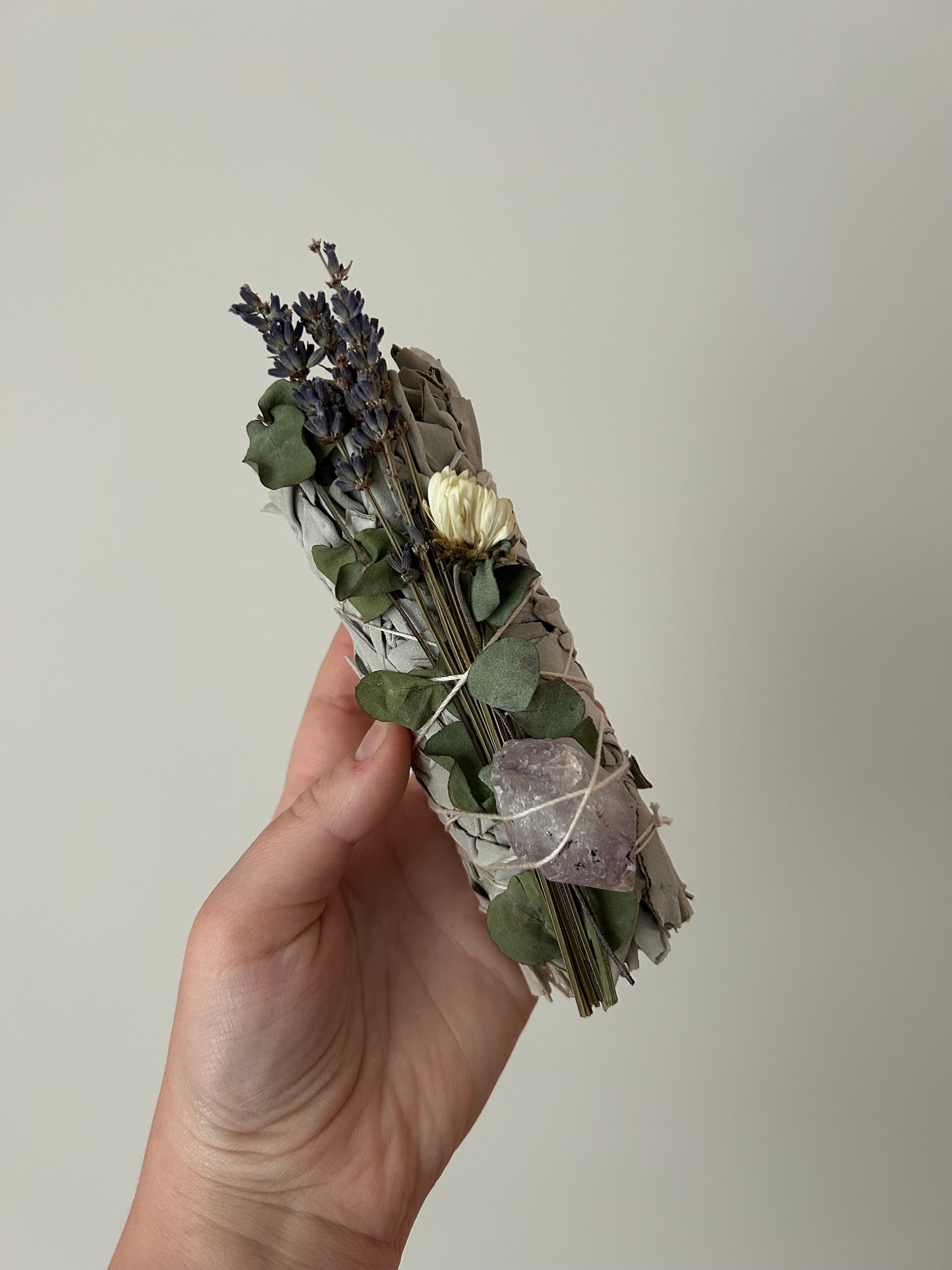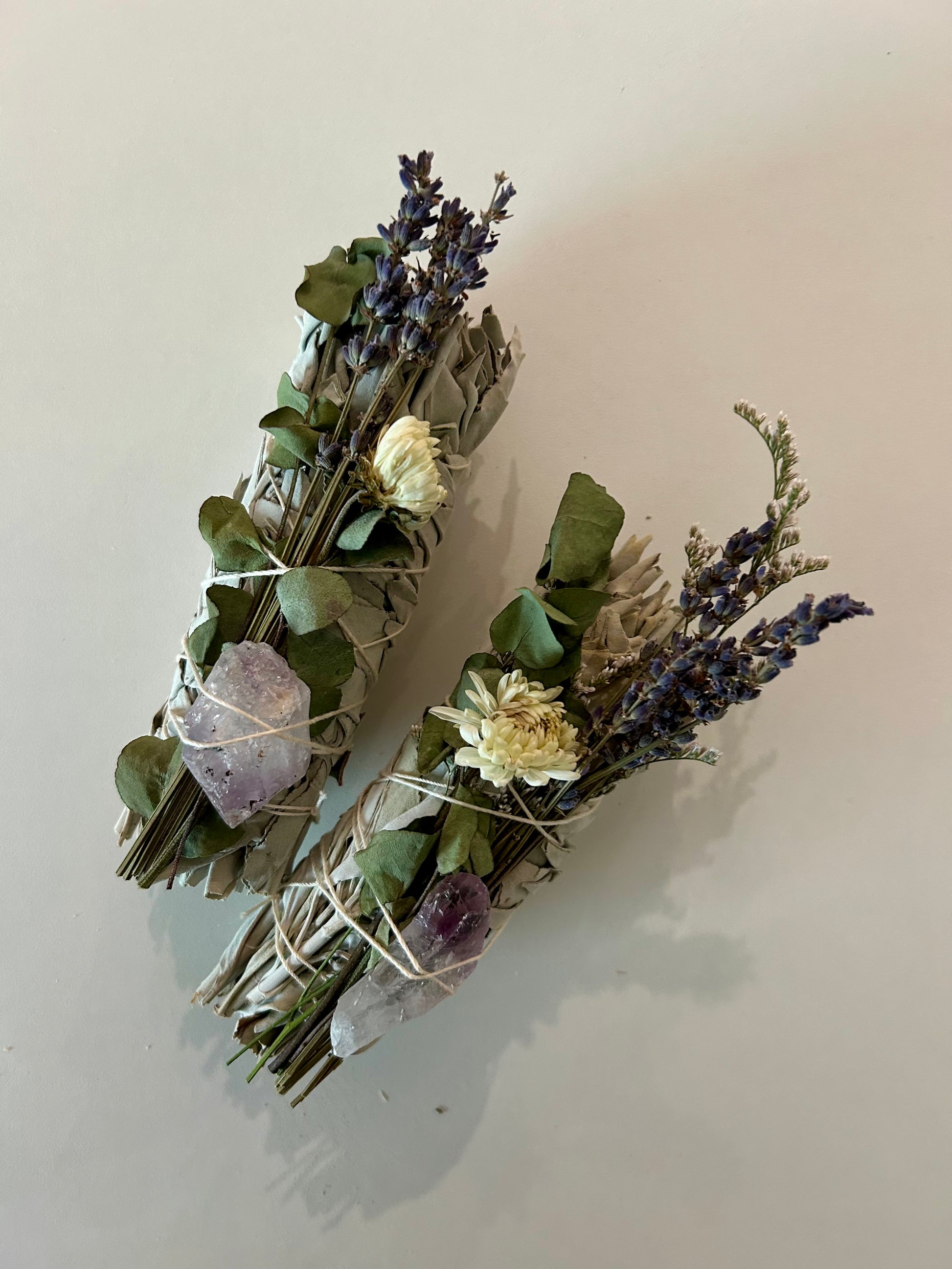 One bundle of premium white sage, tied with calming lavender, beautifully fragrant eucalyptus, and dainty flowers. Made to include a beautifully unique amethyst crystal.