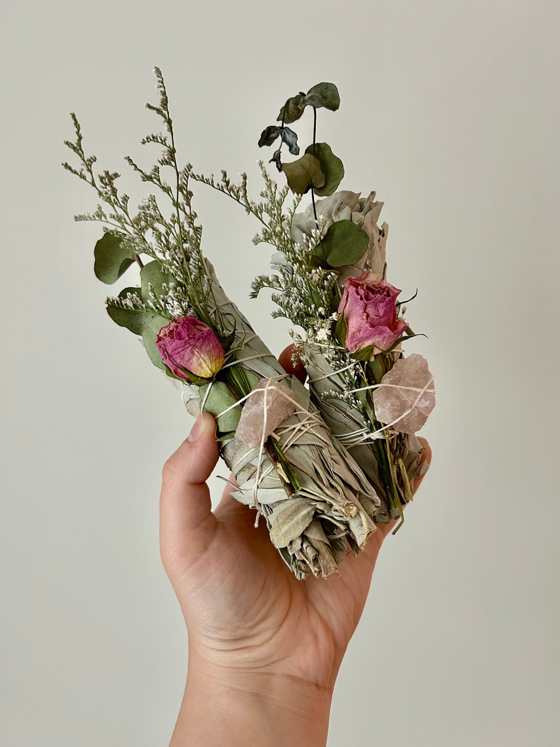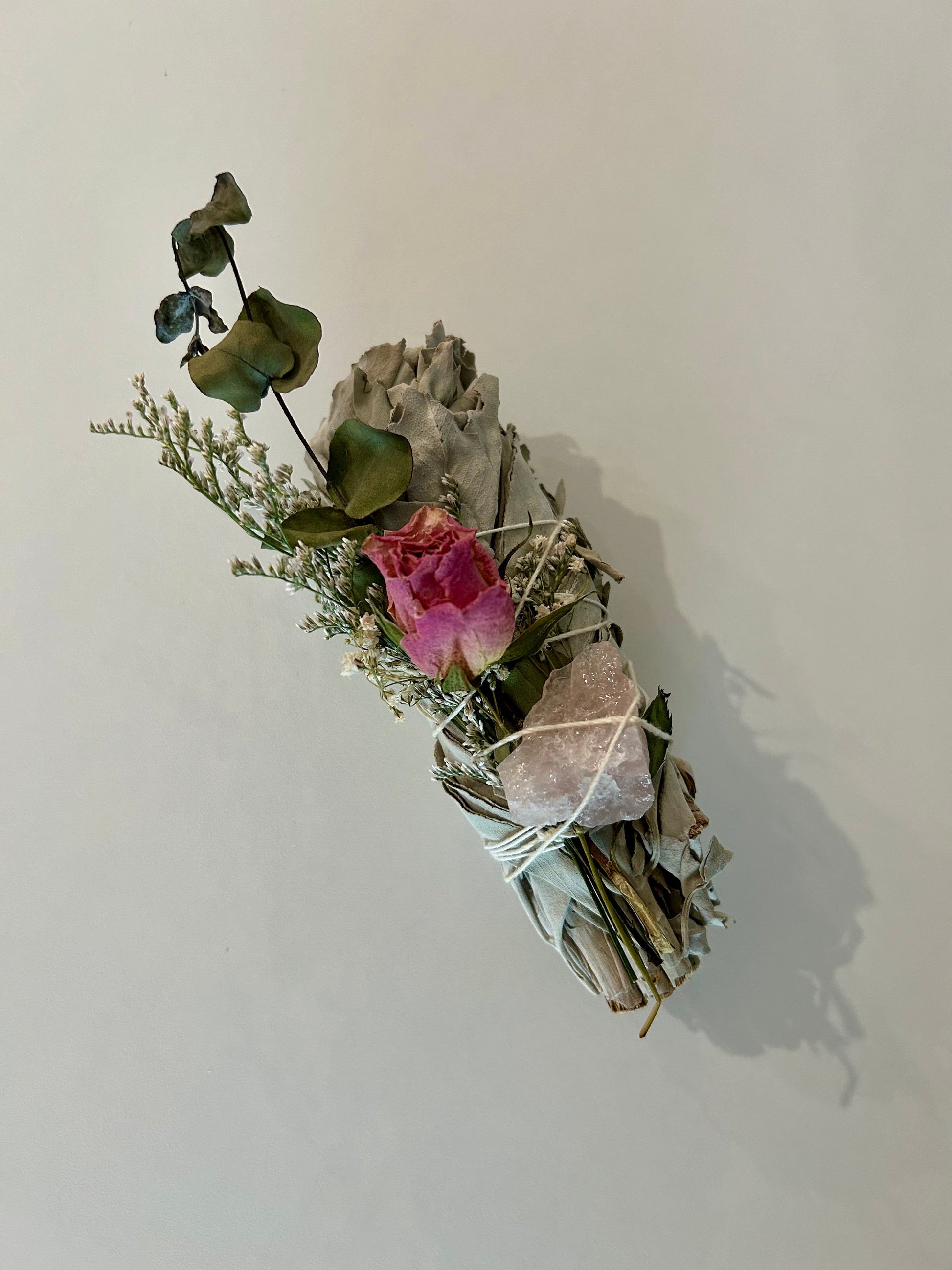 One bundle of premium white sage, tied with delicate dried rose, beautifully fragrant eucalyptus, and soft baby’s breath. Made to include a beautifully unique rose quartz crystal.
